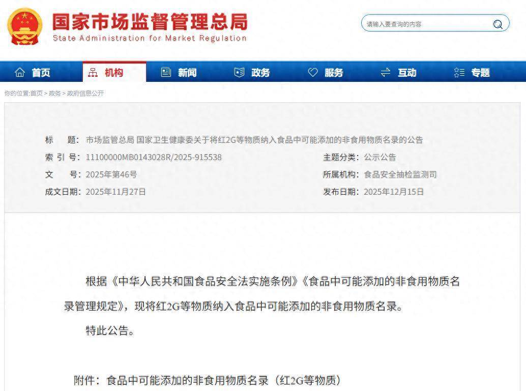 (人民日报健康客户端记者 乔芮)12月15日,国家市场监督管理总局、国家卫生健康委联合发布《关于将红2G等物质纳入食品中可能添加的非食用物质名录的公告》,将红2G、二甲基黄、二乙基黄、西布曲明及其衍生物纳入非食用物质名录。