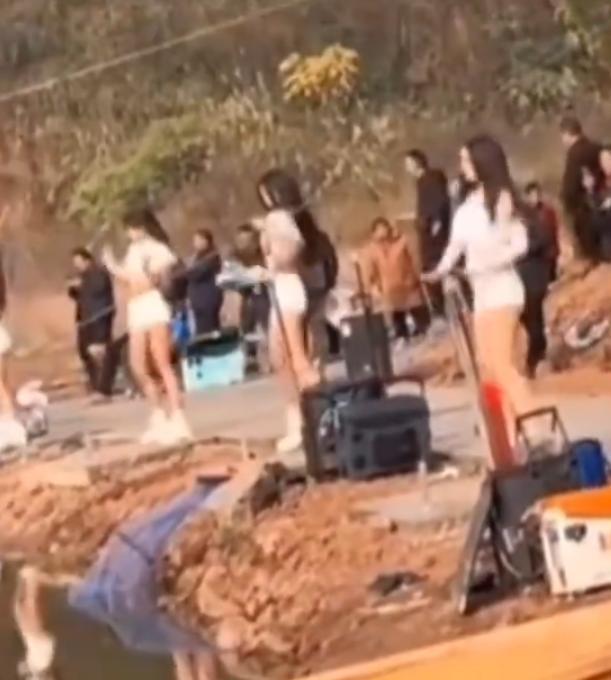 视频中,多名女子身着背心短裤在钓场热舞表演。多名钓鱼爱好者正专注于手中的鱼竿,对身旁的表演表现得十分淡定。