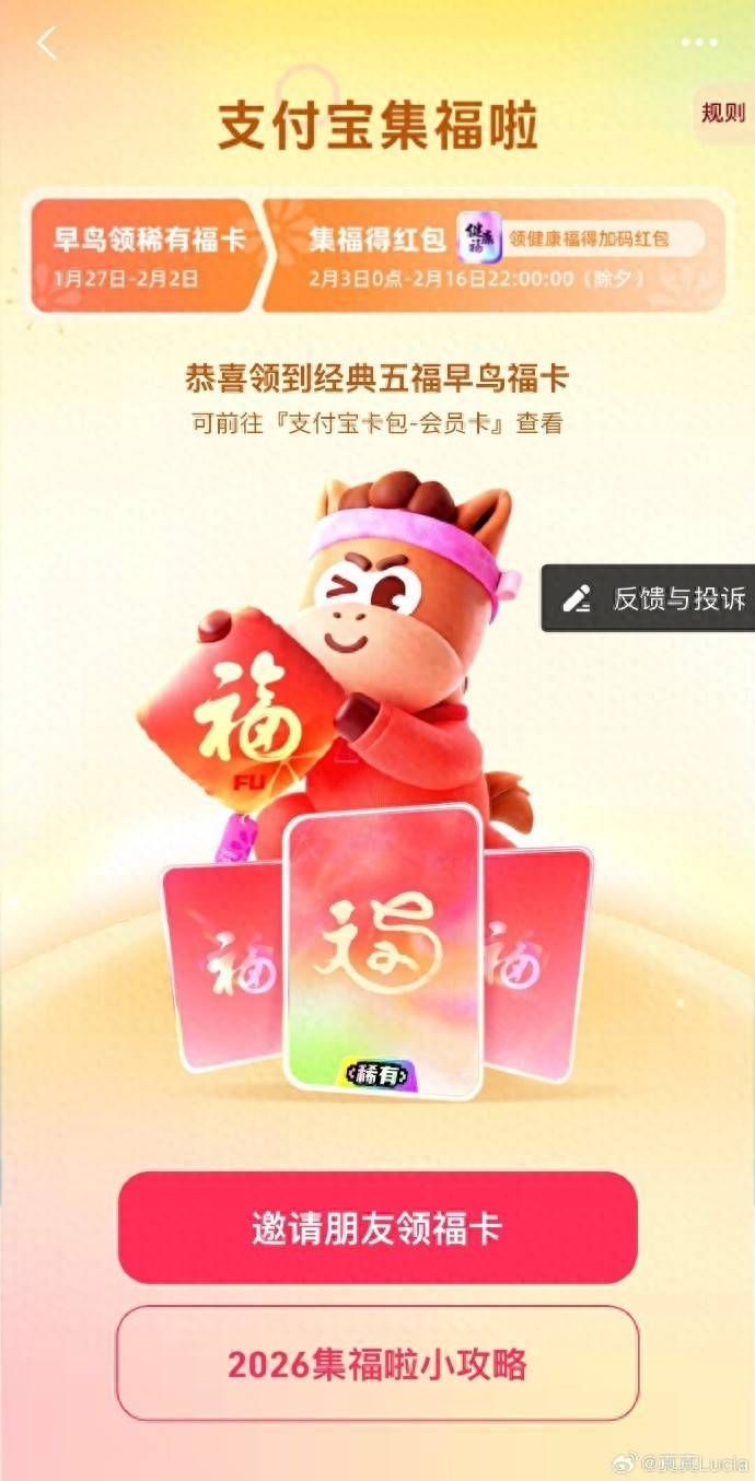 据新浪科技,将于2月3日正式开启的2026年支付宝集五福活动,将在传统五福福卡之外新增一张特殊福卡“健康福”,由蚂蚁集团旗下健康AI应用“蚂蚁阿福”发放,用户集到“健康福”可额外获得一个红包。